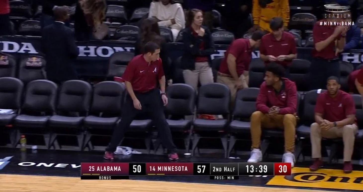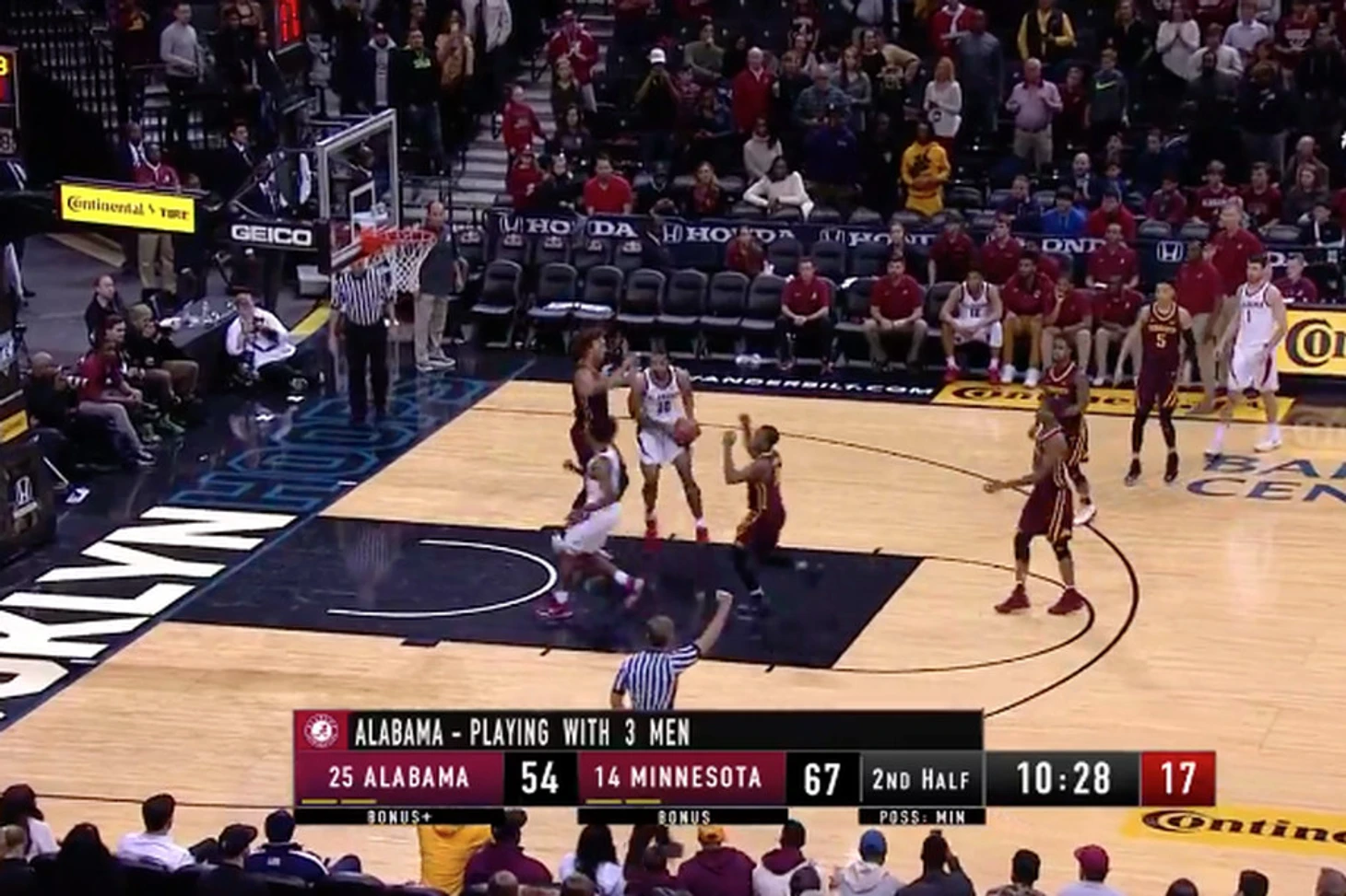 Последние 10 минут в матче между университетами Алабамы и Миннесоты получились совершенно безумными. У Алабамы осталось лишь три баскетболиста на площадке, и в таком составе они едва не отыграли 11-очковое отставание.