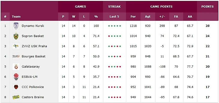 Небольшой спад у динамовок случился перед новым годом. Проблемы были связаны с отсутствием Круз и Петрович. Но даже без двух системообразующих игроков «Динамо» переиграло на выезде «Вильнёв» 63:57. После каникул курянки набрали отличный ход. Разгром следовал за разгромом. Даже обеспечив себе первое место они не остановились. Подарков никто из соперников не получил. По очереди были уничтожены и деклассированы УСК, «Бурж» и «Галатасарай».