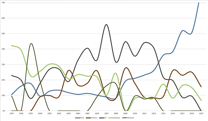 Интересно еще посмотреть как менялся отраслевой состав топ-10, не только национальный. И там тоже было много интересных трендов. Вот примерно как это выглядит: