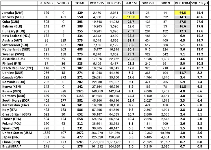 У нас в стране очень популярны постоянное отслеживания различных медальных зачетов различных олимпийских игр, и подозреваю не только у нас, но почему-то никто и никогда не смотрит на них стратегически – то есть шире чем в рамках одной конкретной олимпиады, шире чем в рамках только летних или зимних видов спорта и без привязки к общим олимпийским успехам, экономики и населению той или иной страны. Я решил восполнить этот пробел и сделать такой анализ.