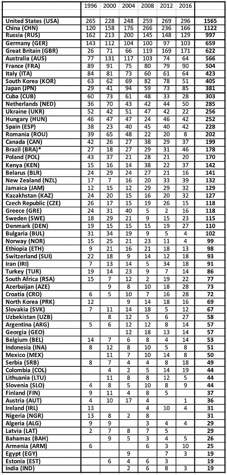 Теперь итоги всех современных летних олимпиад: