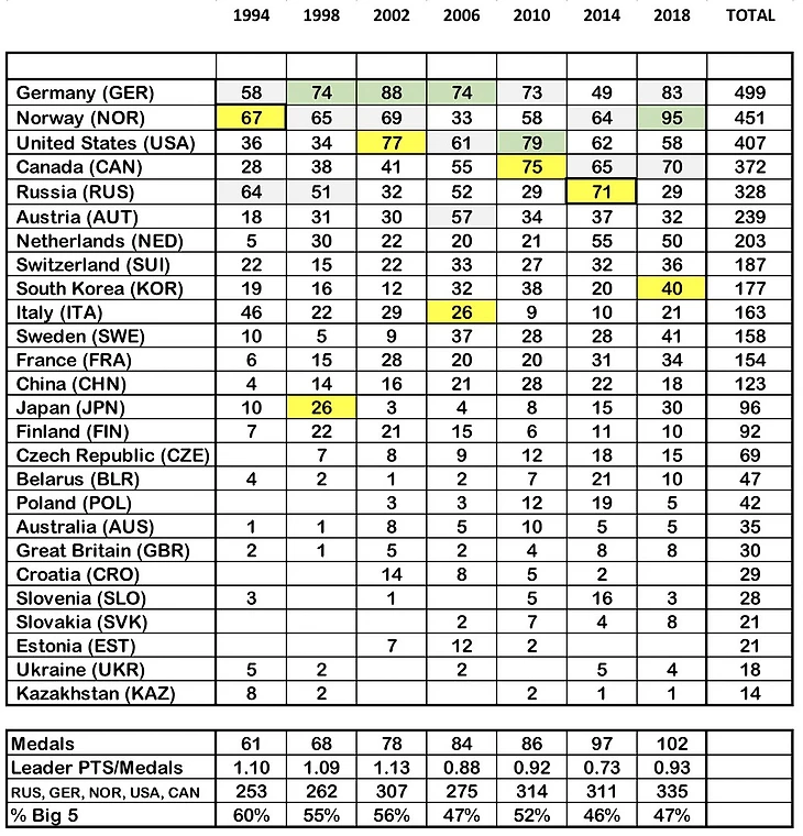 Правда если учитывать количество разыгрываемых комплектов то тут им до рекордов вроде далеко – у них в Корее только 0,93, тогда как у них же дома в 1994 было 1,10 очка за комплект, а у немцев в Солт-Лейк-Сити аж 1,13. Но это очень условно – Олимпиады расширяются как по видам спорта (с 1994 добавились керлинг и сноуборд, где норвежцы весьма слабы), так и по географии - если в 1994-2002 на 5 ведущих зимних стран приходилось 55-60% всех баллов, то в последнее время это стабильно меньше 50% и многие раньше не блиставшие страны сильно подтянулись – Словения, Польша, Беларусь, Чехия, Китай с Кореей, и даже Швеция с Францией резко прибавили. Учитывая, что мы выиграли предыдущие игры, с учетом всех сначала отобранных, а потом возвращенных медалей, с показателем 0,73 – и это на родине, дома – то 0,9 спустя 4 года в другой части света это действительно очень сильно. И это при том, что они полностью провалились в любимом биатлоне, зато добрав в куче других видах спорта – прыжках с трамплина, горных лыжах, коньках, и даже в керлинге и фристайле. То есть теоретически результат мог быть еще выше.