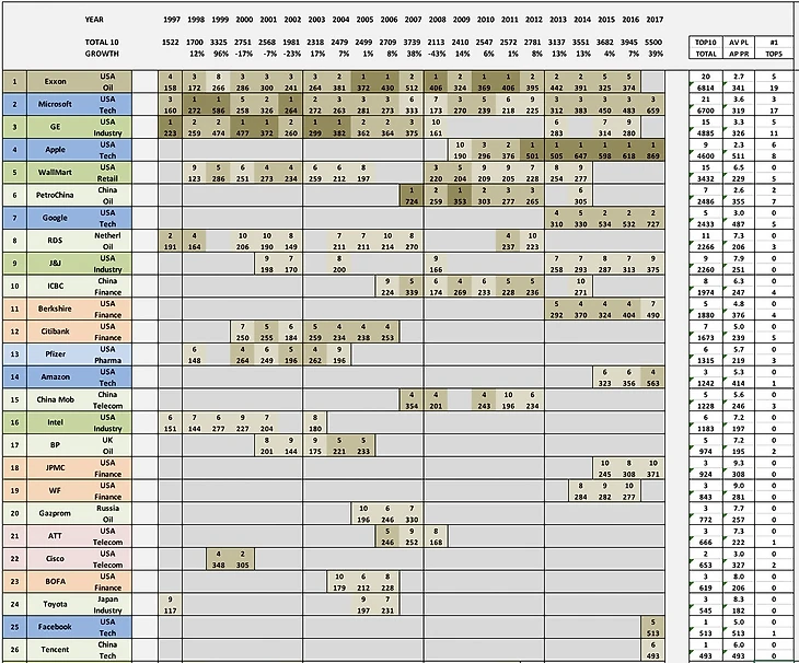 У каждой компании которая попадала когда-либо с 1997 г. в топ-10 тут указано место, которое она занимала в том или ином году - а также рыночная капитализация на конец года. Как ни странно, за это время аж 47(!) компаний мира были в числе 10 крупнейших - то есть обновление там идет довольно значительное - каждый год в среднем 3 компании вылетают из списка, а 3 компании входят - причем в среднем из 3-х вошедших 2 компании полные новички - которых никогда раньше в топ-10 не было. Например в прошлом году в список впервые вошли Фейсбук (и сразу на 5е место), Тенцент и Алибаба. А, например, в 1999, 2009 и 2013 - года сильных структурных перемен - список менялся аж наполовину, в него входили по 5 новых компаний, из которых в 1999 и 2009 по 4 были "свежими" (в 2013 только 3 - но в том числе Google, который очевидно там надолго).