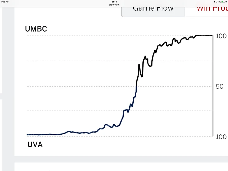 Это все было конечно уже очень круто – но это была затравка. Самое фантастическое началось потом. В конце второго дня играли Вирджиния (1-й номер посева) и 16-я команда – некий UMBC. Не знаю, много ли народу знало эту аббревиатуру вчера – уверен, не очень много кто (это University of Maryland – Baltimore country), я так когда включил игру долго не мог понять, что она вообще обозначает, но сейчас эти 4 буквы в Америке знают, думаю, практически все.