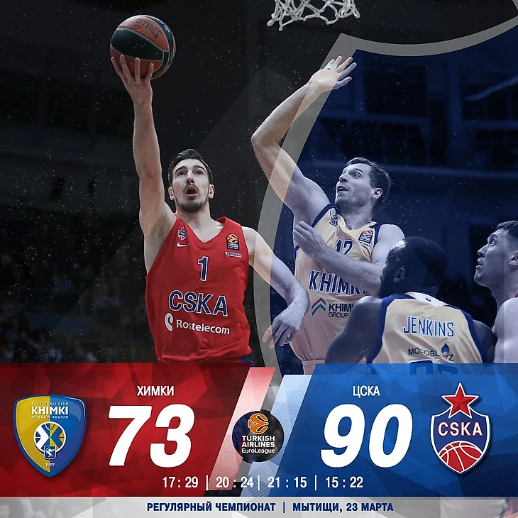 В матче регулярного чемпионата Евролиги ЦСКА на выезде переиграл "Химки" со счетом 90:73. Самым результативным игроком встречи стал защитник химчан Алексей Швед, который набрал 20 очков.