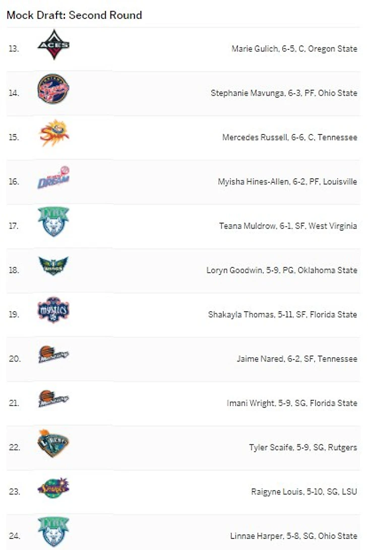 Лучшие игроки из колледжей и иностранные баскетболистки будут претендовать на место в одном из двенадцати клубов лиги. Только 36 баскетболисток будут отобраны в команды лиги.Драфт в женской НБА — это три раунда по двенадцать пиков в каждом. Журналистка Мишел Воупэл сделала прогноз будущего драфта для ESPN.com.