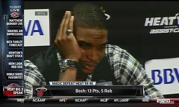 Почему это был он? В прошлом уже плакал после поражений. Подумал, что ЛеБрон и Дуэйн плакали на пресс-конференции и решил, что и ему можно. Не был приглашен на пресс-конференцию к ЛеБрону и Дуэйну.