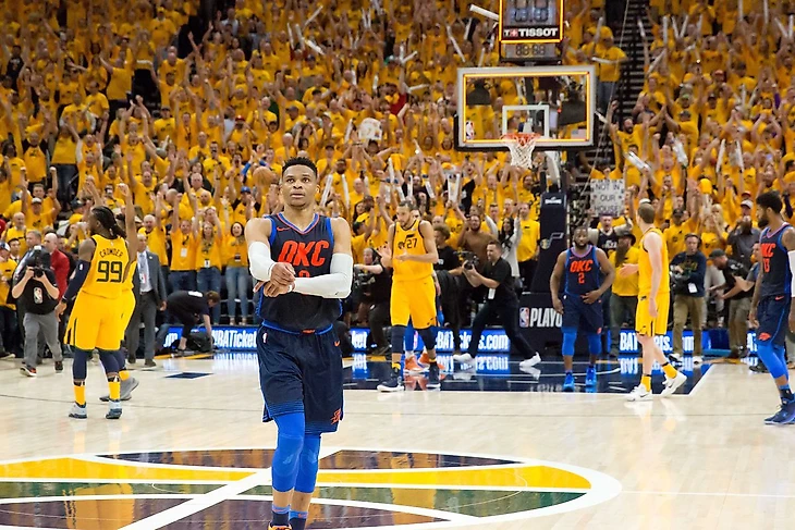 В сентябре, конечно же, все шутили про то, что новоиспечённому Биг-3 надо выдавать 3 мячика на игру, а то Кармело и Уэстбрук не любят делиться - и всё же понимали, что трио заведёт "Оклахому" на высокую строчку в конференции. В ноябре-декабре и вовсе была эйфория по тому поводу, какую результативность Уэстбрук/Мело/Джордж демонстрируют. Потом восхищения стало меньше из-за падения результатов и худшего в карьере сезона Энтони - но второй раунд всё равно казался обязательным условием. А тут ещё и такой подарок в виде "Юты", состоящей из специалистов по защите и выстрелившего новичка Митчелла, у которого, конечно же, не было опыта игры в раундах на выбывание.