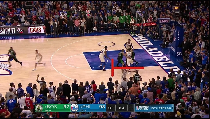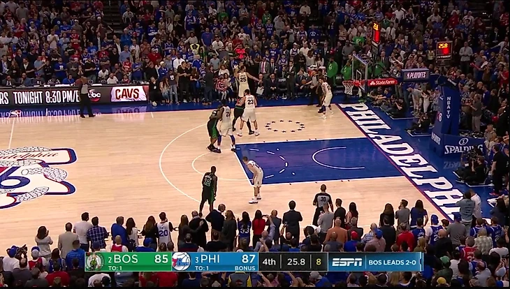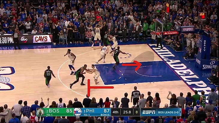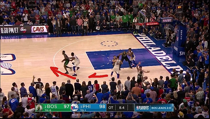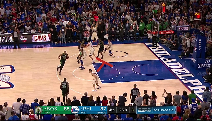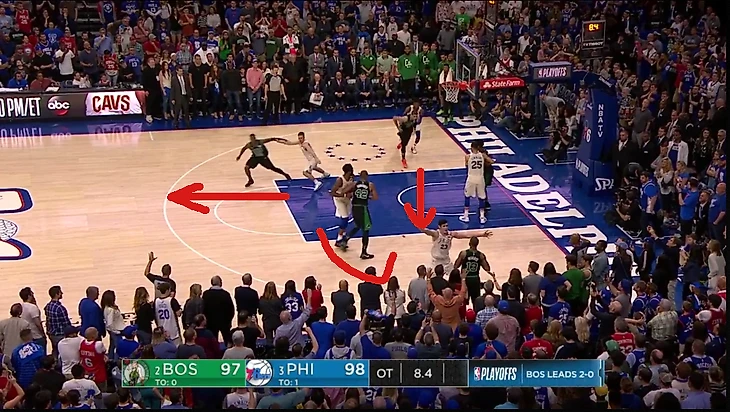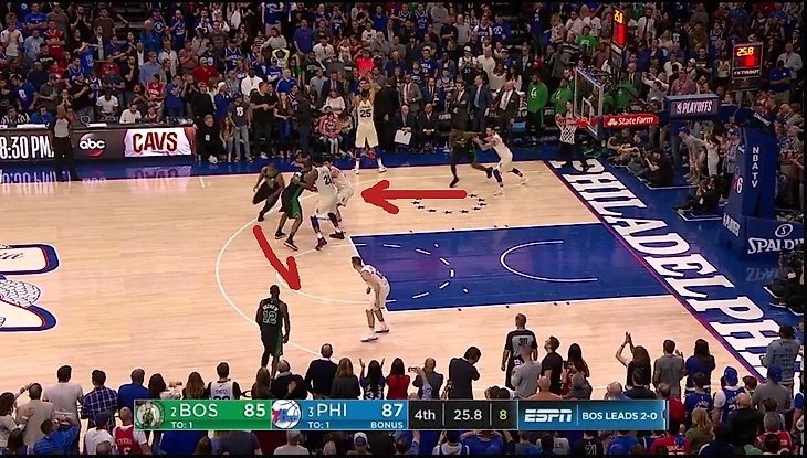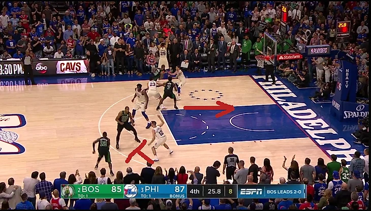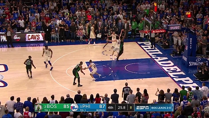 И Браун, и Тэйтум бегут под открывание на периметр, уводя Эмбиида подальше от щита. Хорфорд остается против Ковингтона.