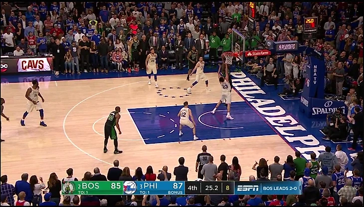 Но тут уже вопрос лишь исполнения. Бен Симмонс огромный, но он не может помешать Тэйтуму подвесить параболу прямо в «краску».