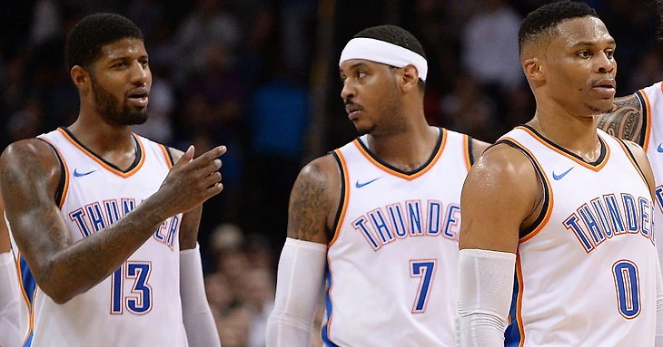 Но даже несмотря на наличие двух крайне опасных атакующих опций, да ещё и гиганта Адамса под кольцом, Уэстбрук все равно совершал почти половину бросков команды, когда находился на площадке. Это значит, что Джордж и Энтони должны были подстраиваться под Рассела и его "большое эго". И если Энтони все понял ещё вначале сезона, смирившись с ролью третьей скрипки (но не хотел мириться с количеством игрового времени), то Джордж, понимая что ему в следующем году нужна максималка от Лейкерс, старался играть в привычном стиле, который никак не совпадал со стилем Уэстбрука. В результате мы получили ту же Оклахому, победа которой зависела исключительно от того пойдёт ли у Расса бросок или нет. Он снова доминировал. Но не над соперниками, а над своими звёздными одноклубниками.