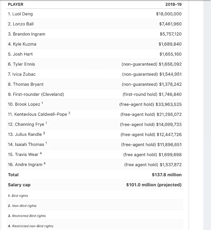 Для самой команды в 2019 году будет важна гибкость в платежке, и План «Б» заключается в подписании игроков на однолетние контракты, включая собственных свободных агентов – Брука Лопеза, Кентавиуса Колдуэлл-Поупа, Айзейи Томаса. В платежке «Лейкерс» есть 46 свободных миллионов на подобные подписания, что даст им преимущество перед другими командами, не обладающими подобной роскошью. Например, для Томаса, который будет получать предложения в районе 8 миллионов в год, гораздо лучшей перспективой является возможность переподписания на бОльшую сумму на один год. Это допускается только в том случае, если медицинский штаб «Лейкерс» уверен полностью в восстановлении Айзейи от травмы бедра.