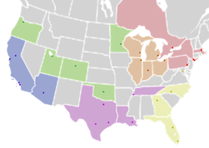 Иногда в городе (точнее, местности – я сгруппировал города по их агломерациям, например, Окленд и Сан-Франциско – вместе, Сент-Пол и Миннеаполис – тоже), было несколько команд одновременно. Если клубы из одного города играли в одной лиге, то для них будут раздельные сборные, потому что собирать вместе игроков, противостоявших друг другу в каком-то сезоне, несправедливо. Отдельно я выделил: