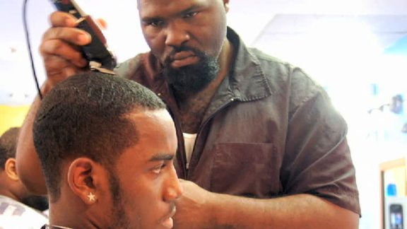Суровый парикмахер делает стрижку не менее суровому Ракиму.