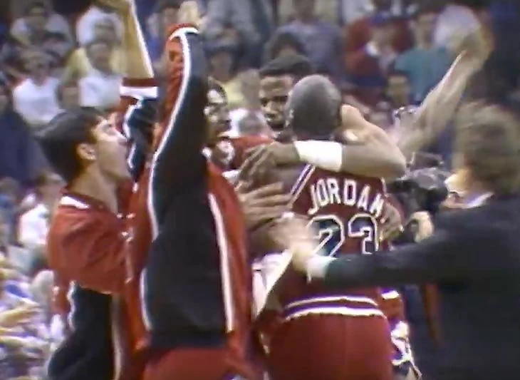 Джордан приземляется и устраивает одно из самых эмоциональных празднований карьеры – выпрыгивает с ударом кулака в воздух, ожесточенно машет руками перед собой, потом оказывается в объятиях команды. (Эти кадры быстро станут классикой. Но изначально их не показывают в эфире – камеры фокусируются на беготне тренерского штаба).