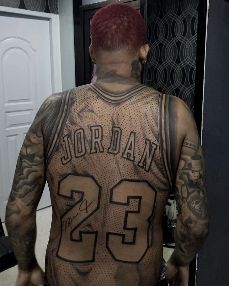 Front family tattoo выложил фотографию лучшей работы в истории баскетбола. Один из фанатов Джордана набил тату с джерси игрока. Решились бы сделать себе такое?