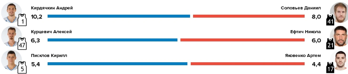 Если смотреть на индивидуальные показатели результативности, то у хозяев лучший игрок по набранным очкам - Александр Мартынов (16.3 очков за игру), а у гостей - Алексей Голяхов (17.6 очков).