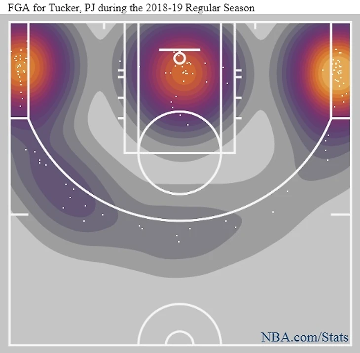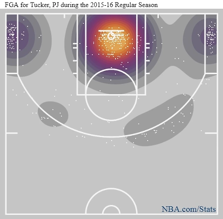 Такер – уникум, способный держать игрока любых габаритов и параметров, от могучего бигмена до юркого разыгрывающего. Незаменимый боец для плей-офф, в системе “Рокетс” Пи Джей раскрыл в себе неожиданные качества. Такер оказался эталонным трехочковым снайпером. Диаграммы говорят громче любых слов, вот карта бросков форварда из сезона-2015/2016, от звонка до звонка в составе “Финикса”.