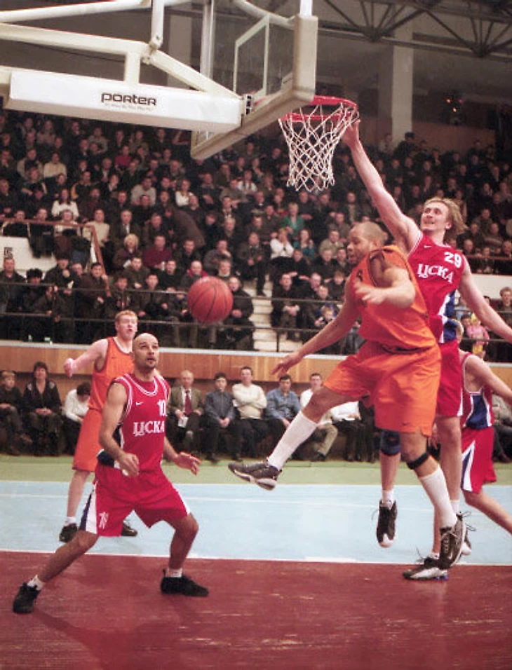 3 марта 2001. «Шахтер» — ЦСКА — 109:103. Армейцы Рой Роджерсон (№40) и Андрей Кириленко (№ 13) пытаются прервать атаку Деррика Джонсона (№21)