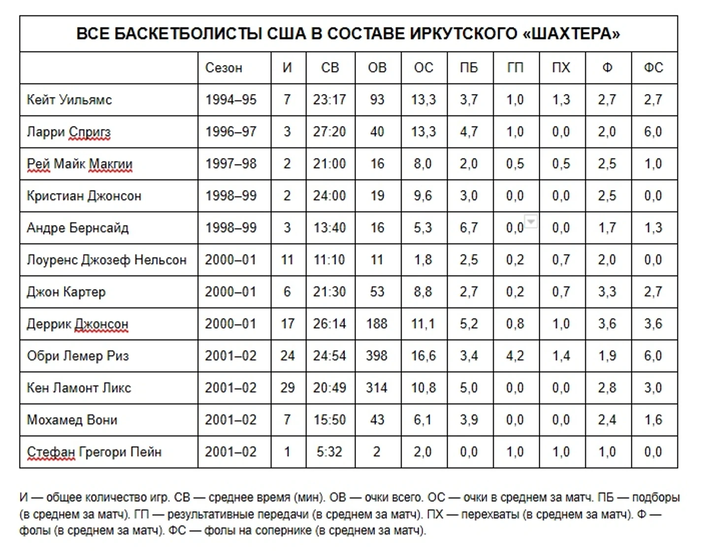 На этот раз связка была хороша, к примеру в победном матче в Санкт–Петербурге со «Спартаком» (81:64) именно вклад американцев в победу был самым весомым. Но Картер в «Шахтере» не задержался, провел только 6 игр (по сути, сбежал из России, не по душе ему пришелся наш быт). А вот прибывший вместе с ним Деррик Джонсон, первый из американских легионеров, кто провел в команде полноценные полсезона (17 игр). До «Шахтера» Деррик (а сосватал его в Иркутск, как и других американцев, хорошо уже известный нам Ларри Спригз) играл в американской лиге западного побережья IBL, а еще ранее выступал за клубы Бразилии, Польши и Южной Кореи.
