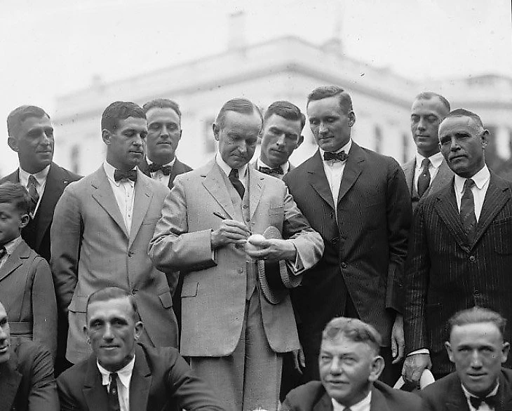 Впервые это случилось в 1924-м. Выиграв титул, бейсбольная команда «Сенаторс» из столицы Америки получила соответствующее приглашение, потому что об этом очень уж просили местные болельщики. Известно при этом, что тогдашний президент Калвин Кулидж вообще-то уважал бейсбол. Известно также, что его супруга игру любила гораздо сильнее.