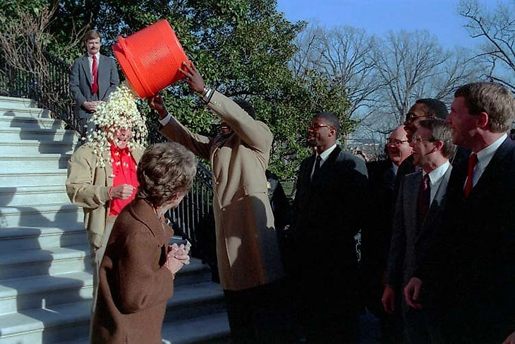 Команды НФЛ начали регулярно приходить в Белый дом со второй половины 80-х. Всем особенно запомнилось, как в 87-м Гарри Карсон опрокинул ведро с попкорном на голову президенту.