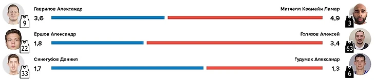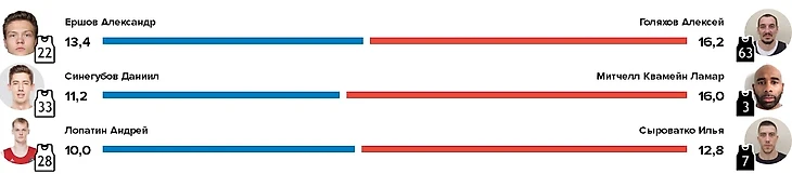 Алексей Голяхов набирает 16.2 очков за игру, Квамейн Митчелл – 16.0. У хозяев Александр Ершов набирает 13.4 очков, Даниил Синегубов 11.2.