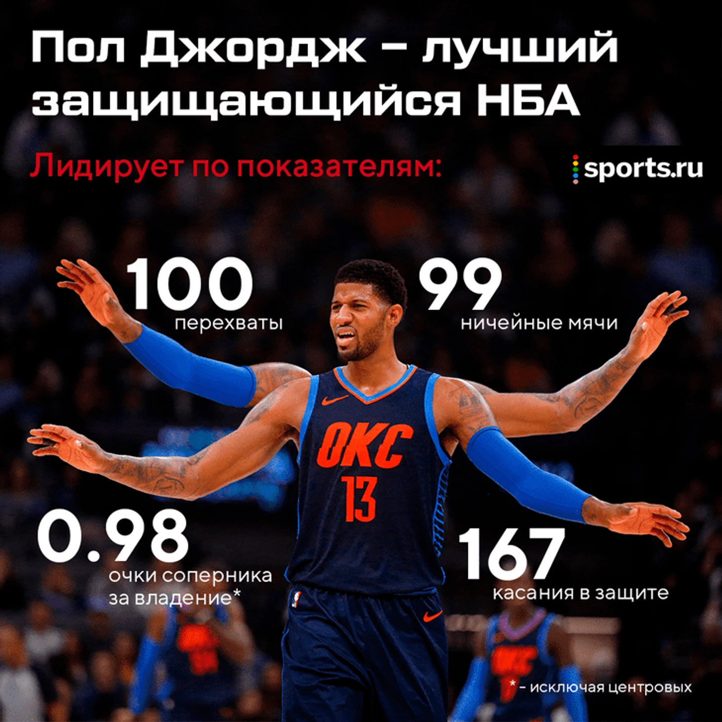 Но с точки зрения защиты это вообще феноменальный сезон. Не будет преувеличением сказать, что лучший в лиге в этом году. Статистика это подтверждает, Пол Джордж лидирует в НБА сразу по нескольким ключевым показателям: