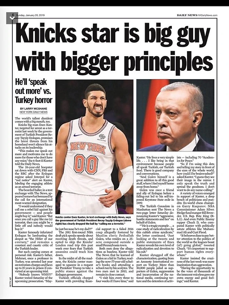 Неделю назад «Нью-Йорк» и «Вашингтон» играли матч НБА в Лондоне – лига традиционно возит две команды в Англию в середине регулярного сезона. Кантер заявил, что пропустит этот выезд из-за страха за свою жизнь: «Даже если бы у меня было американское гражданство, я бы не полетел в Великобританию, где меня могут похитить или убить турецкие агенты. У Эрдогана длинные руки».