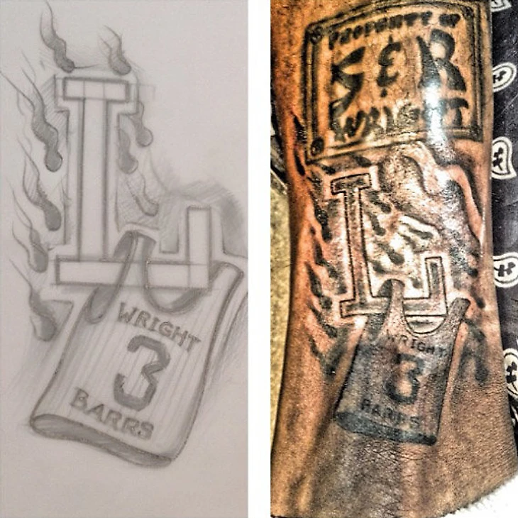 На самой важной татуировке на теле легкого форварда изображена буква L (логотип школы), на которой висит та самая майка с третьим номером. Сверху начертано – Райт, а снизу – Баррс. Пока это тату с ним, он будет выкладываться за их двоих. И пока его ноги и тело работают безотказно, соперникам «Локомотива» нужно опасаться.