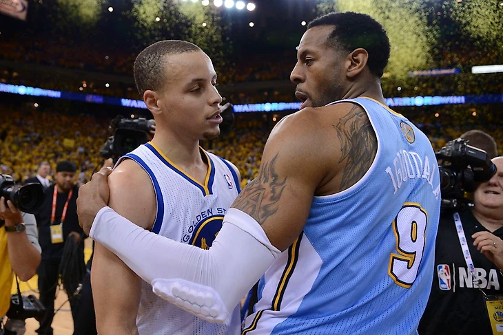 Андре Игудала разговаривает со Стефеном Карри, после своей последней игры за Денвер