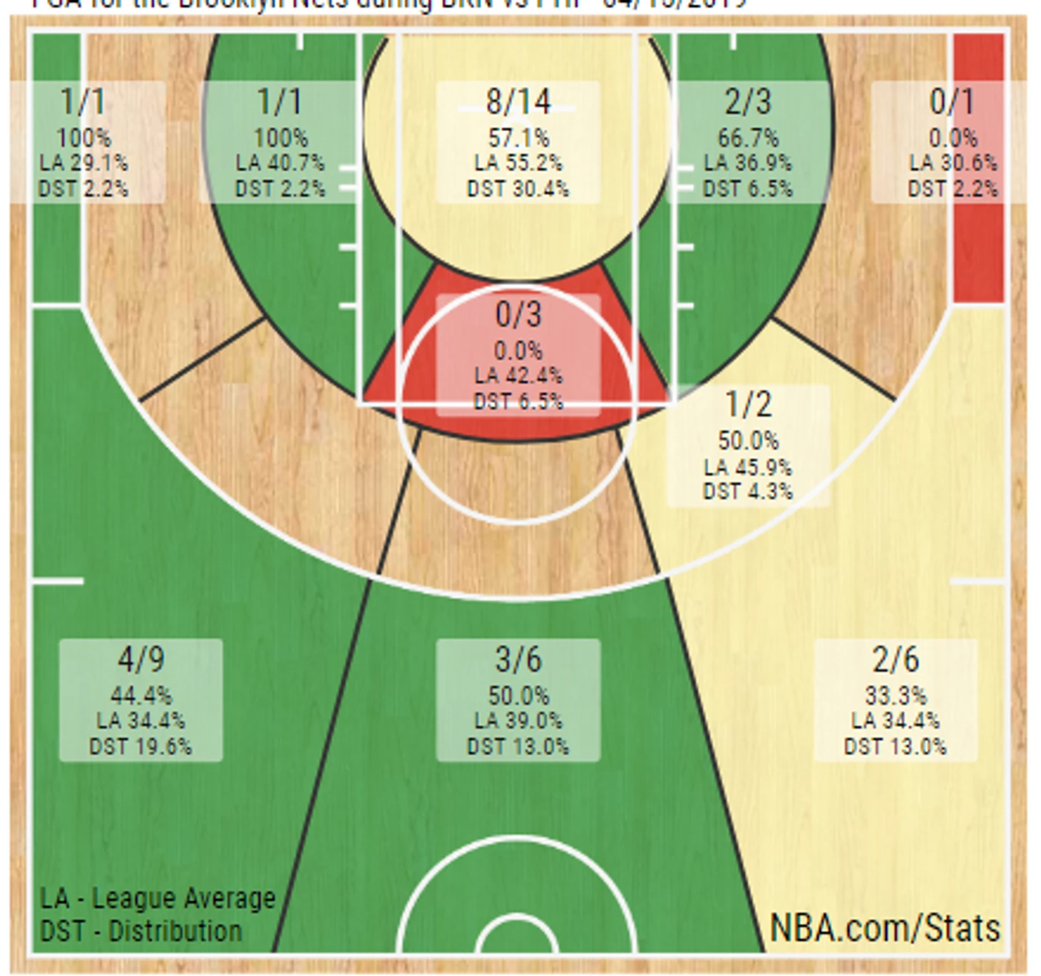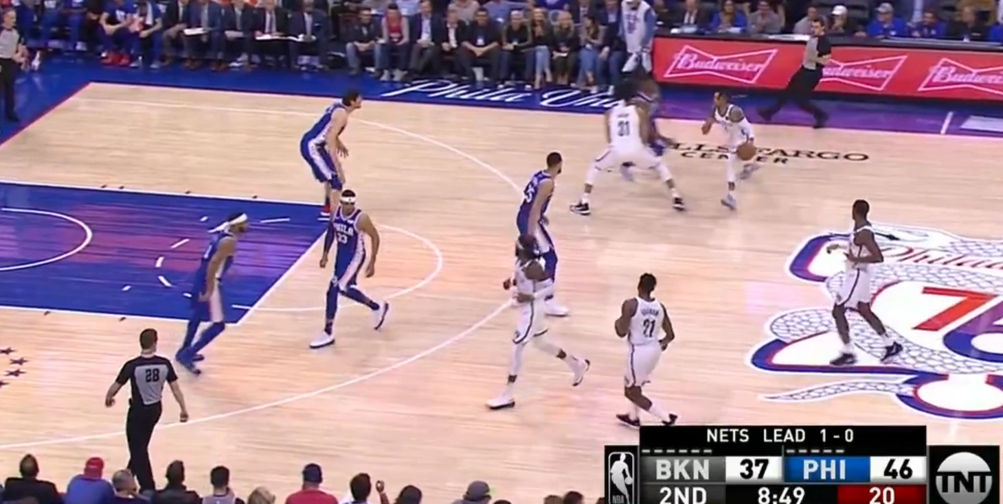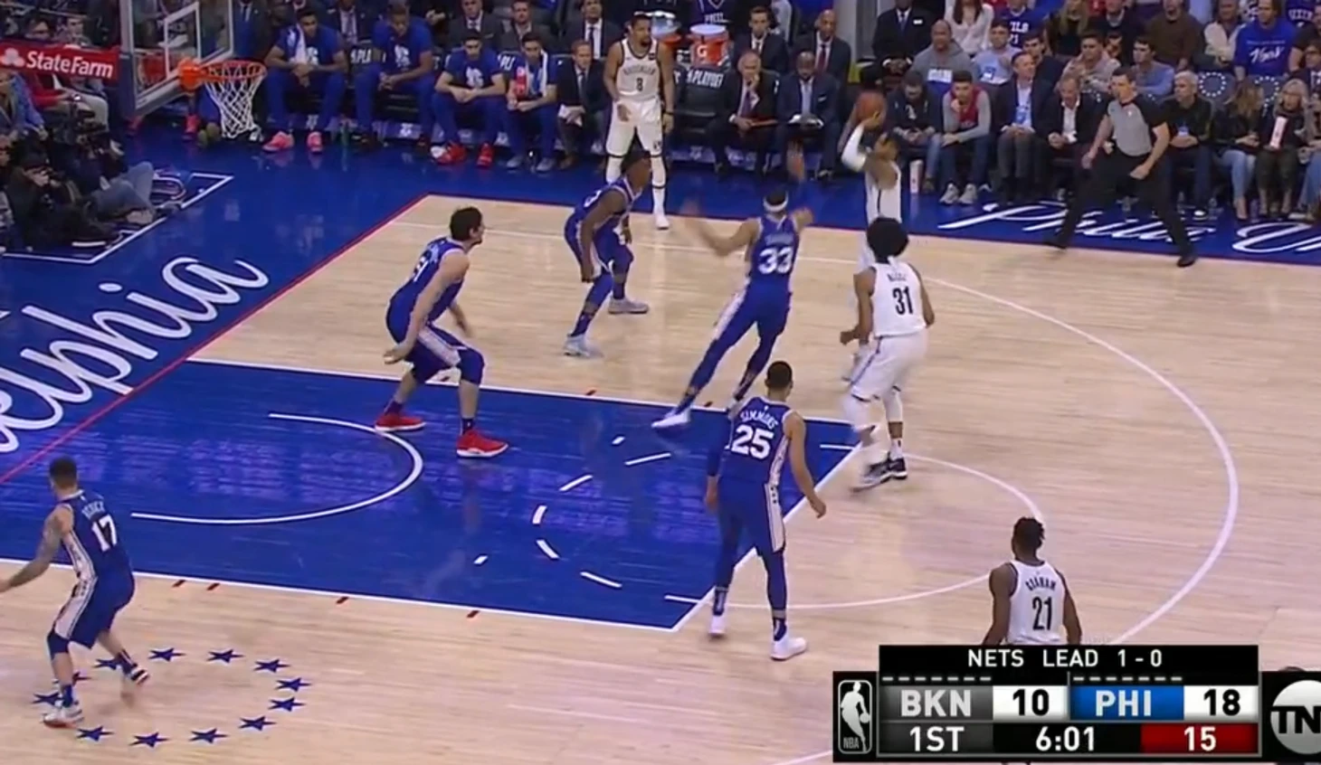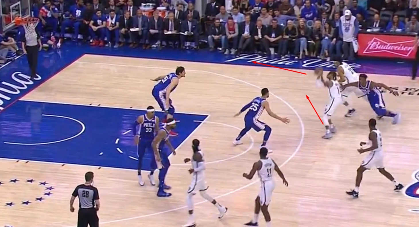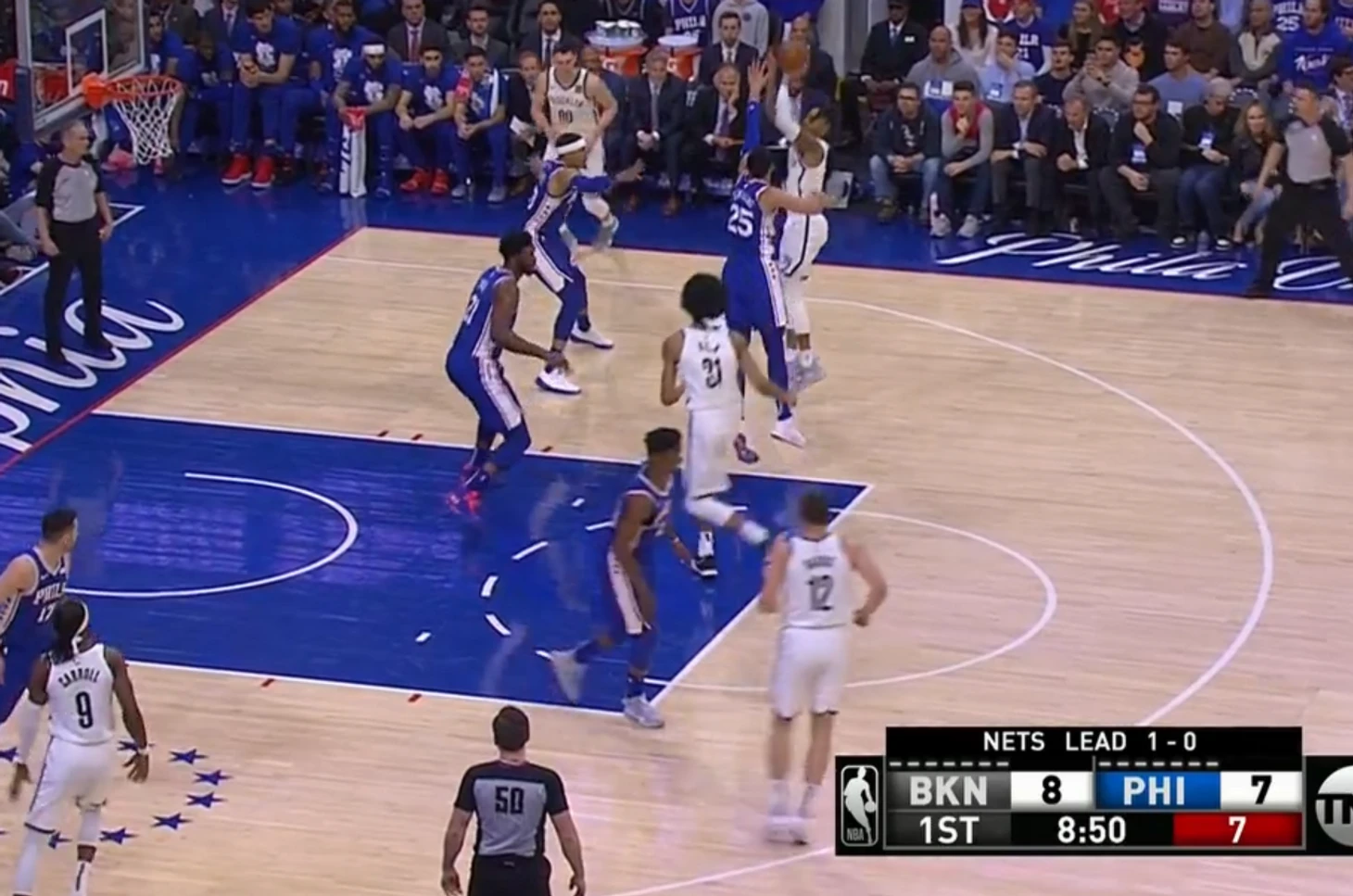 Эмбид за матч получал раза 4-5 мяч будучи свободным на дуге и во всех случаях переходил к атаке кольца из краски, а не пытался выбросить трешку, так же Фила начала часто задействовать игрока в районе штрафной линии, откуда идет розыгрыш мяча или бросок, чего раньше они не делали, сконцентрировавшись на игре почти в 3 человека у кольца Бруклина используя тем самым свое преимущество в антропометрии. Тот же Эмбид очень активно атаковал через Аллена и казалось что у игрока Бруклина 0 шансов хоть что то поделать с Эмбидом.