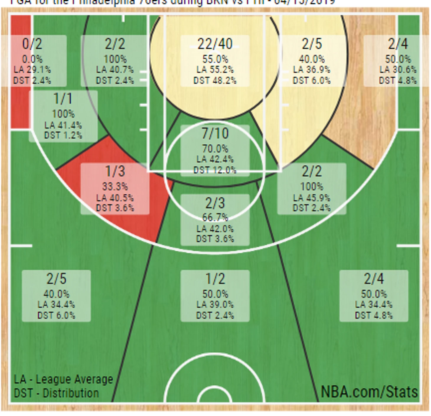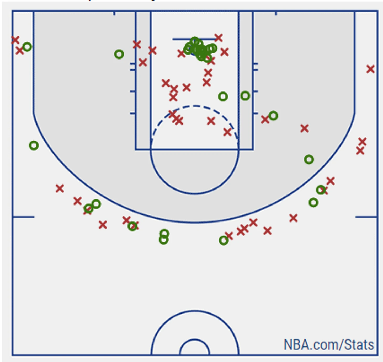 Они очень сильно изменили свою игру, уже нет акцента на атаку из за дуги, атакуют оттуда если будет открытый игрок, а вот вся остальная атака у Филадельфии проходит через Краску и возле нее.