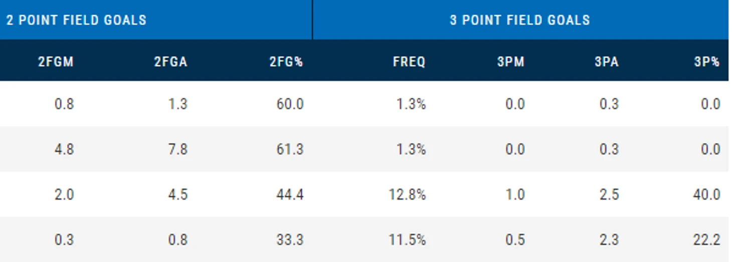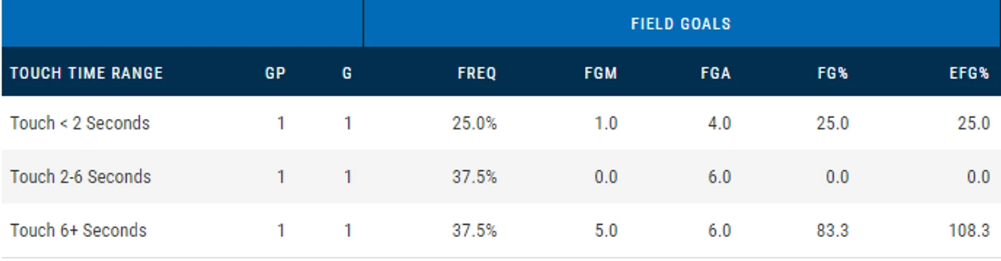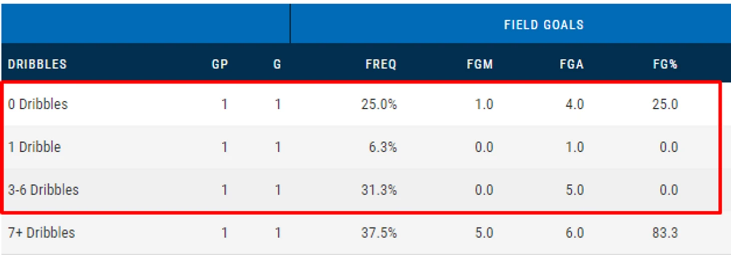 Нижние две строчки это количество ударов в пол мяча, 4-6 (3 строчка) и 7+ (4 строчка), статистика Рассела очень сильно падает когда он заигрывается, это сезонная стата против Филадельфии, его процент двушек не достигает и 40%, трешек еще меньше 1.5 из почти 5, это 30% от силы. Кэтч энд шут он почти не выбрасывает в сериях с Филадельфией.