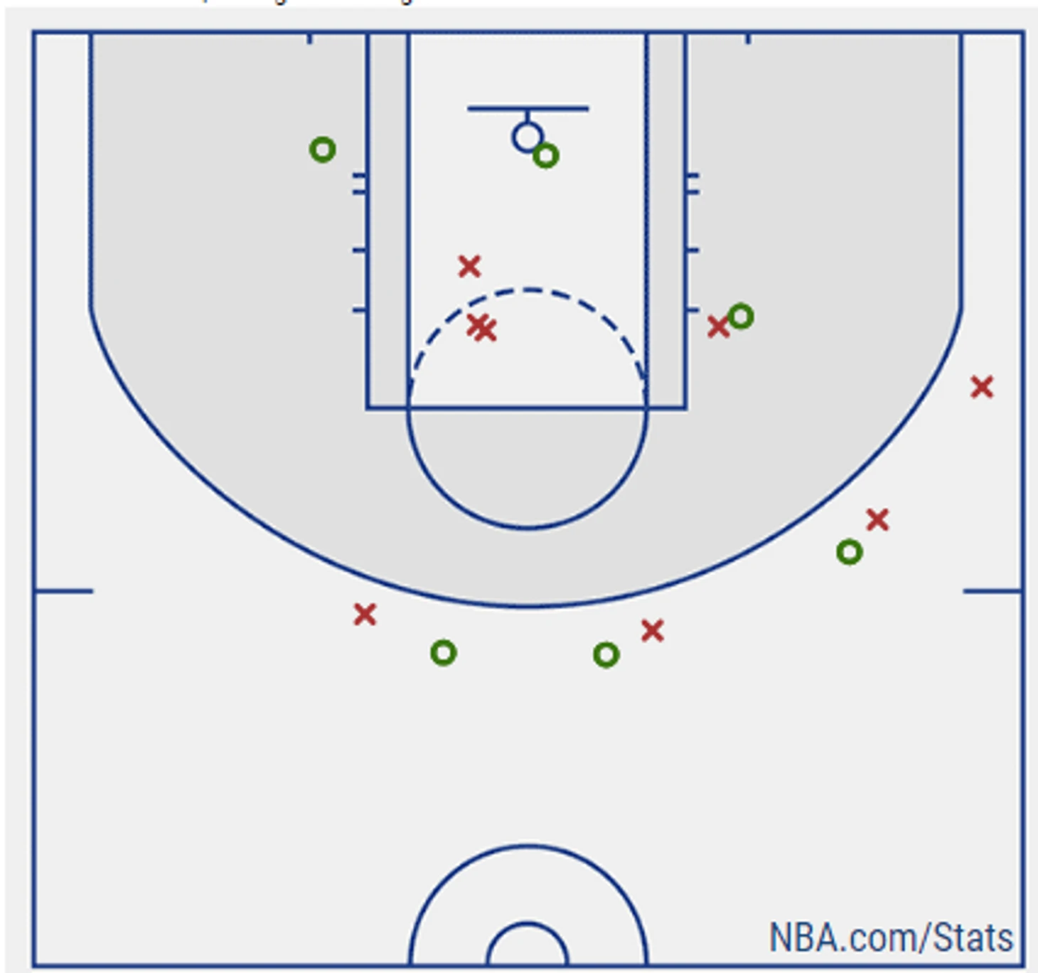 Снова эта же картина, стоит Расселу играть без мяча, как он превращается в игрока Д-лиги. И как мы выше видим, без мяча он всегда закрыт или возле него соперник, то есть он кидает 66% своих бросков зная что он заведомо в проигрышной ситуации и его могут накрыть или ему неудобно кидать!