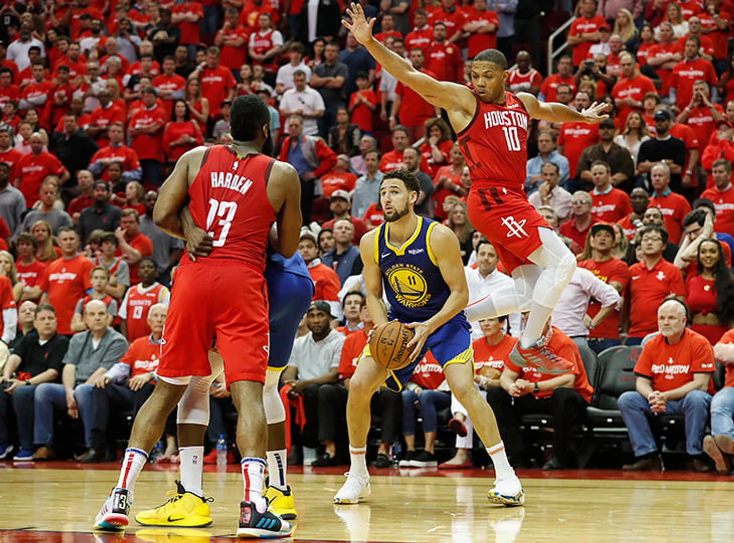 Потому что оборона «Голден Стэйта» не ждет, пока ты пройдешь в центр. Оборона «Голден Стэйта» не открывает тебе сторону. Это было наглядно продемонстрировано в серии с «Хьюстоном» при опеке Хардена (и Лилларда в противостоянии с «Блэйзерс», если это кого-то волнует). Тут предельное давление именно на периметр, любой заслон на мяче – это размен или сдваивание. Никаких свободных зон и времени на раздумья, оборона «Уорриорс» форсирует максимально быстрые решения максимально далеко от кольца.