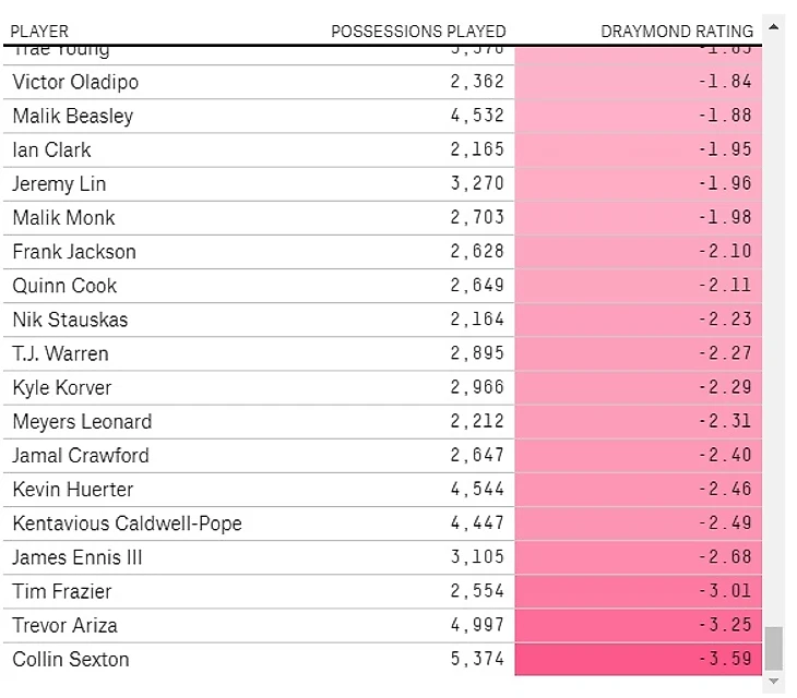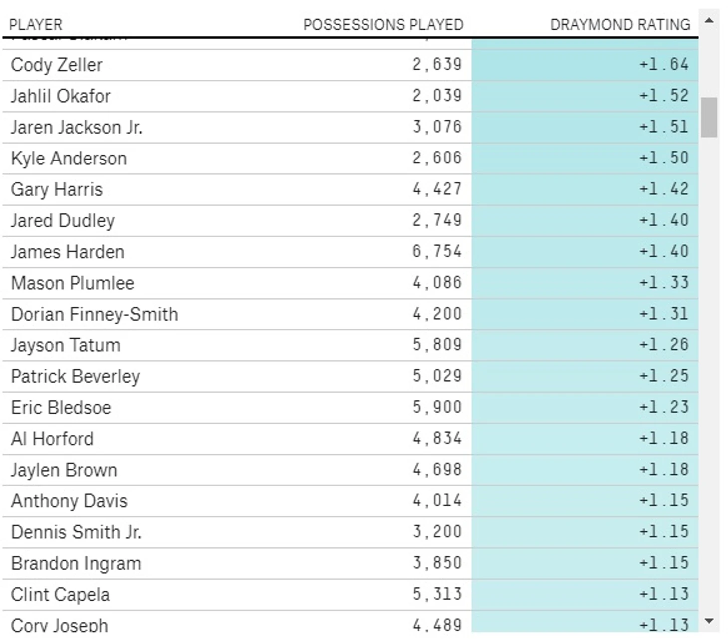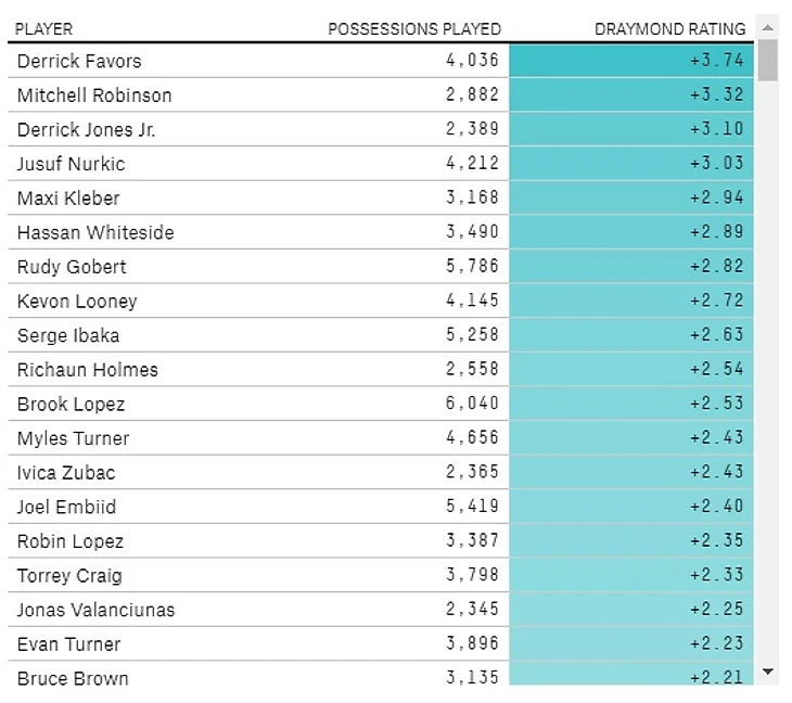 А вот данные за прошлый сезон (2018-19), с минимум 2000 защищенных владений. Топовым был Деррик Фейворс из «Юты», за ним – Митчелл Робинсон из «Никс», худшим же стал Коллин Секстон из «Кавс».