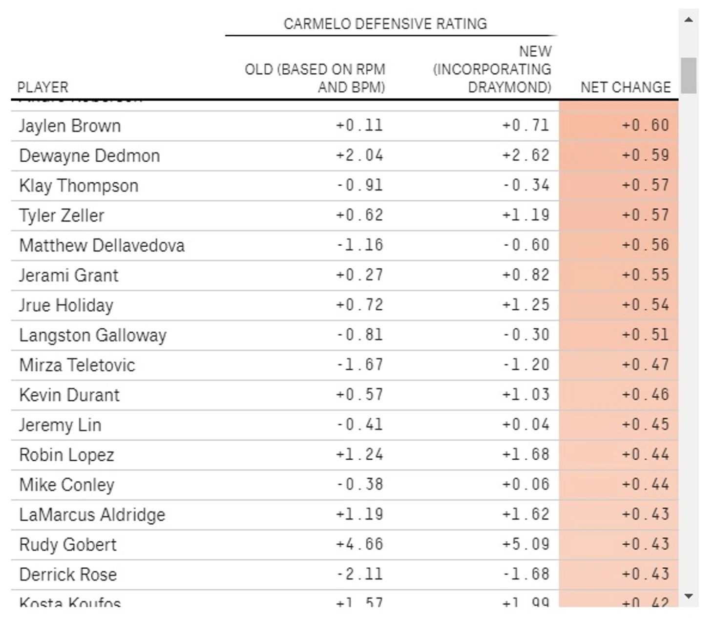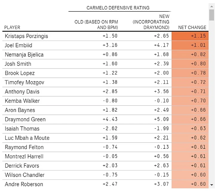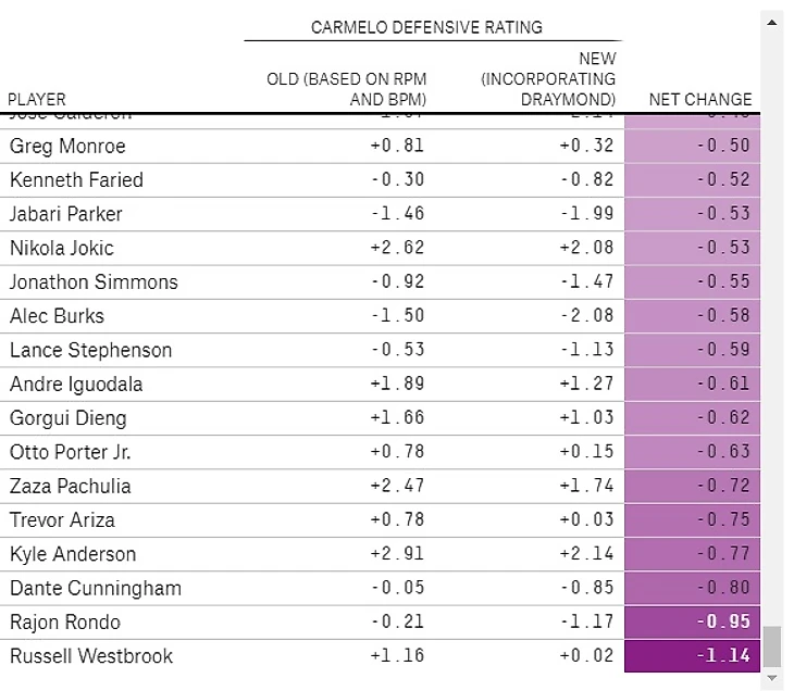 В завершение приведем список игроков, которые в наибольшей степени, положительно или отрицательно, затронуты появлением ДРЭЙМОНДа. В приведенной ниже таблице сравниваются наши старые защитные рейтинги КАРМЕЛО, основанные на сочетании двух третей RPM и одной трети BPM, с нашей новой версией, которая все еще использует эту статистику, но также использует и ДРЭЙМОНДа. Далее приведены старый и новый защитные рейтинги для всех, кто по крайне мере сыграл в 10 000 владений с 2013-14.