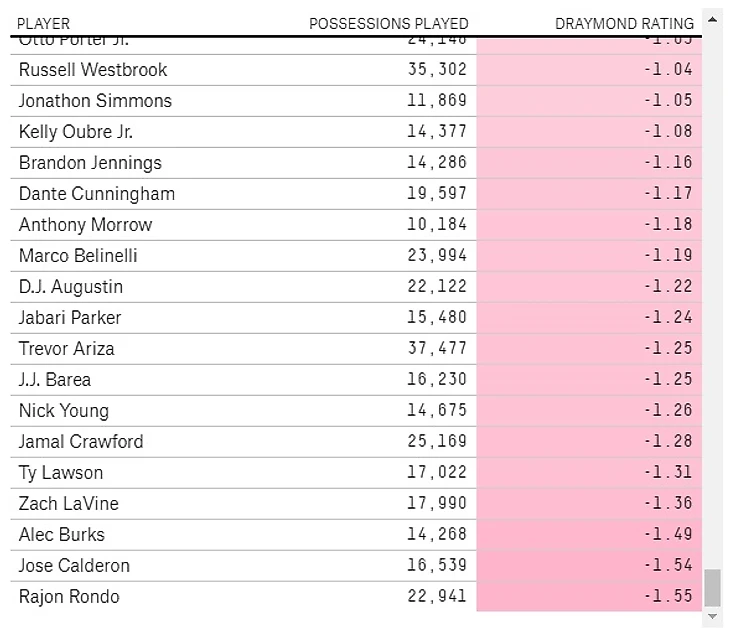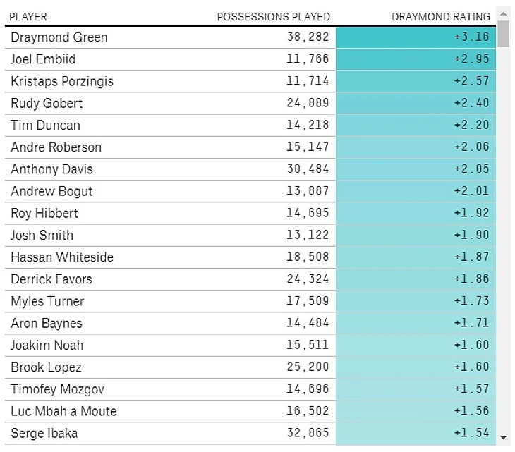 Среди всех игроков, которые сыграли в минимум 10,000 владениях за последние шесть сезонов (данные о бросках оппонентов считаются с сезона 2013-14), топовый игрок обороны по версии ДРЭЙМОНД – это … Дрэймонд Грин, который принес «Уорриорс» по +3,2 очка за 100 владений в виде оборонительной ценности, основанной сугубо на его помехе броскам соперника, не считая всего остального (например, перехватов). За Грином следует список, довольно-таки усыпанный звездами: Джоэль Эмбиид, Кристапс Порзингис (!), Руди Гобер, Тим Данкан, Андре Роберсон и Энтони Дэвис. Между тем, защитник с наихудшим рейтингом за последние шесть сезонов по версии ДРЭЙМОНД – Рэджон Рондо.