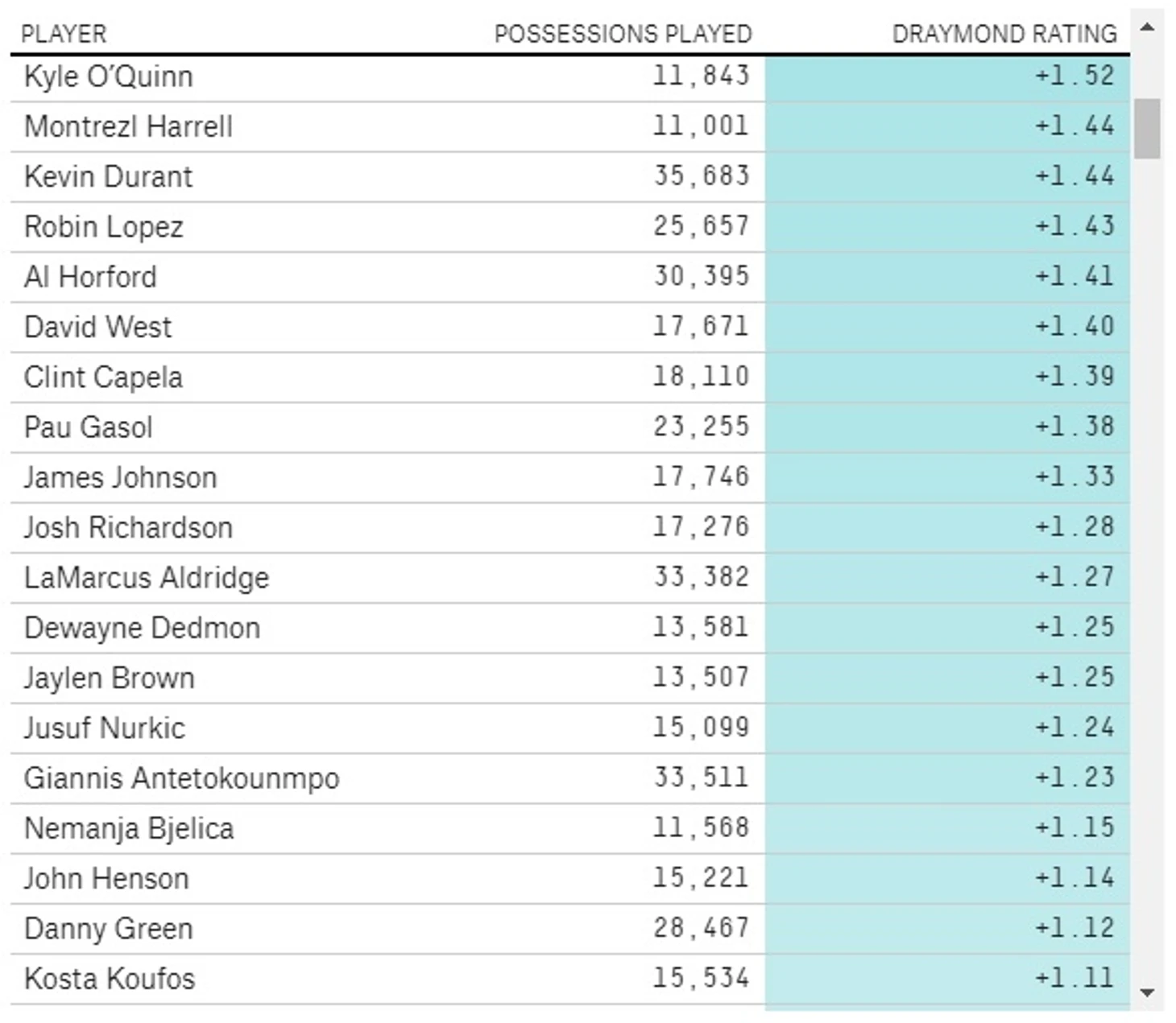 Мы разделяем СЫРОГО_ДРЭЙМОНДа по количеству владений, при которых игрок находился на паркете, так что ДРЭЙМОНД (как RPM и большинство других метрик в НБА) является скорее рейтингом, а не статистическим показателем.