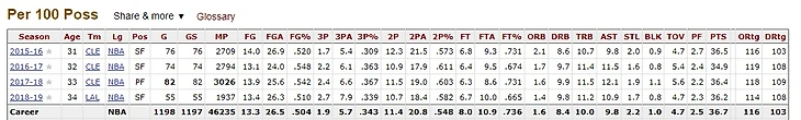 Сезон 2018-19 подарил нам не только нового чемпиона и возвращение блудного сына Кавая на уровень суперзвезды, но и показал, что Леброн все-таки человек, и этот человек стареет. Леброн получил неприятную травму и сыграл рекордно-малое количество игр (55). Давайте сразу проясню: я не считаю, что Леброн пришел в ЛАЛ доигрывать только из-за Голливуда и прочего, что Леброн не понимал, насколько Запад серьезнее Востока. Леброн всем всё уже доказал. НО под ударом его историческое наследие, его место в истории. Когда он в одиночку тащил Кливленд в плей-офф 2017-18, казалось, что над ним не властно время, однако на протяжении прошедшего сезона Леброн не внушал такого трепета своей игрой. Возможно сказалась травма и не самый подходящий состав. Леброн откровенно бросил играть в защите – почти каждую неделю в хайлайтах (или у Шака) мы могли видеть, как через него забивают или ставят блок королю. А еще чаще видели его бездействие в защите. Но и в атаке все было не на королевском уровне: только 3 раза за карьеру у Леброна был ат. рейтинг ниже 114 (из них 99 – в первом сезоне). Снизился % попаданий со всех дистанций, уменьшилось кол-во передач и защитные показатели.