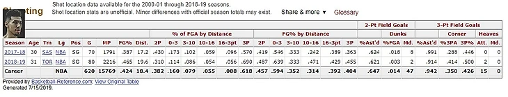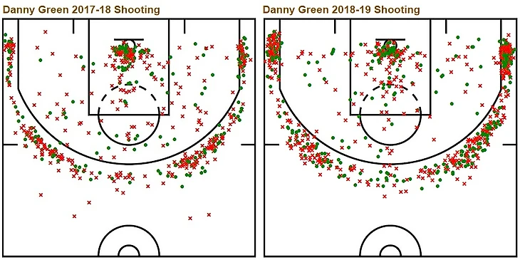 Здесь надо обратить внимание на изменение частоты бросков у Грина с углов в САС 2017-18 и Торонто 2018-19 – Дэнни реально стал больше и точнее бросать именно с углов, ожидая скидки от Кавая или Лаури.