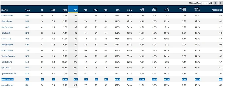 Итак, переходим к Леброну. В сезоне 2018-19 Леброн стал чаще играть ПНР – 7,5 из своих владений за игру (28%) и набирал 0,98 очка за владение. Для сравнения в Кливленде за последние 3 года (2 с Кайри и 17-18 без него) количество ПНР не превышало 5,5 (последний сезон за Кавс) владений. Леброн был среди наиболее эффективных игроков, использующих ПНР более 5 владений за игру.