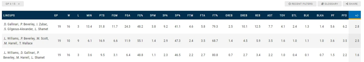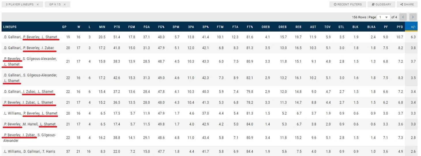 + Беверли, Шамет и Зубац хорошо сыгрались в прошлом сезоне, Лэндри отлично играл чистого снайпера (несмотря на то, что это был его дебютный сезон).