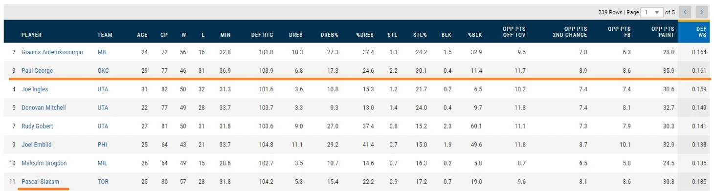 Джордж вошел в тройку DPOY и MVP. При этом многие специалисты отмечали, что Джордж по праву лучший защитник на периметре и неуступчив в посте и было бы справедливо, если бы он получил награду DPOY. По показателю DEF WS Джордж незначительно уступил Яннису: