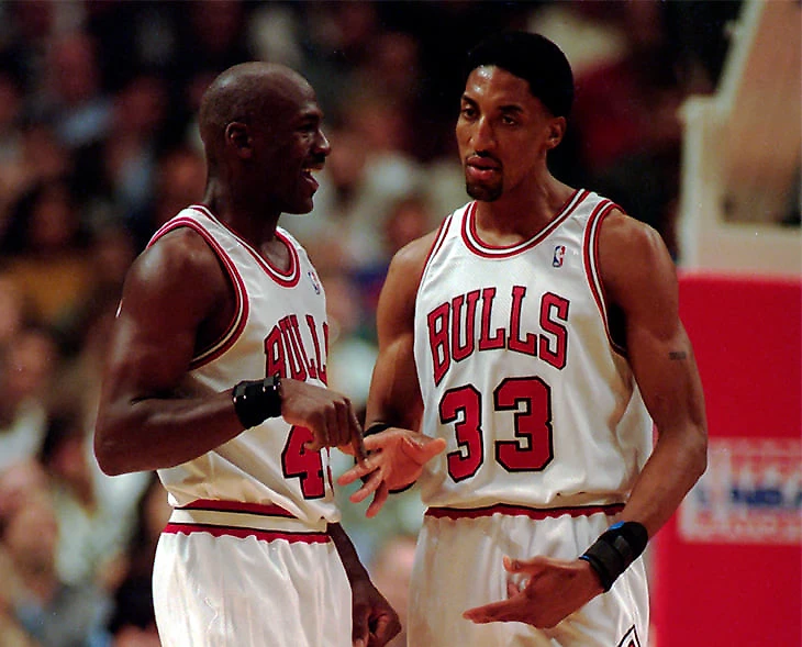Без разделения на маленький–большой Джордан и Пиппен были взаимозаменяемы и, по сути, выполняли одни и те же действия на площадке и имели схожую статистику по подборам и ассистам (6.2/5.3 у Джордана; 6.4/5.2 у Пипа).