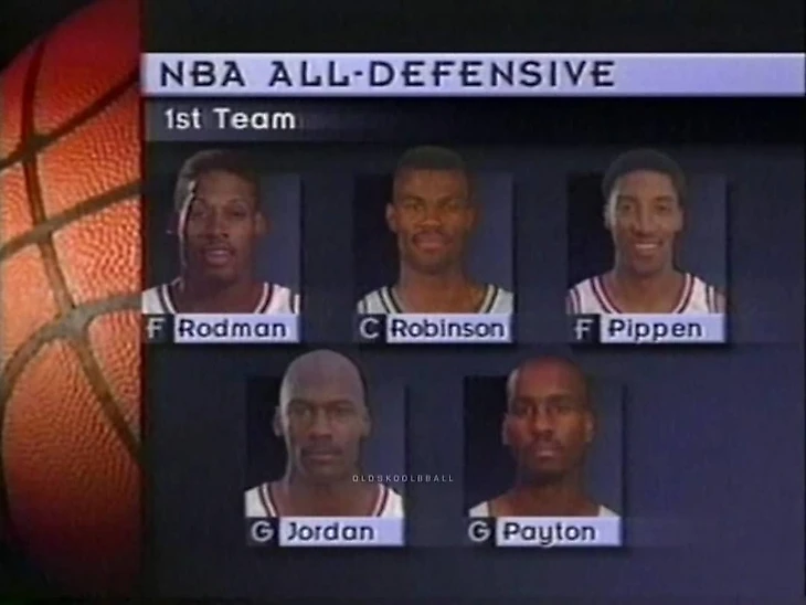 Какие она вызывает у Вас эмоции? У меня – восторг. Три из пяти лучших защищающихся игроков года были собраны в одной команде. Понимаете? А теперь вспомним, что легендарные «Буллз» при этом считались командой с сильным перекосом на атаку. Уму непостижимо!