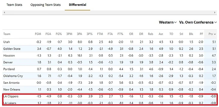 В прошедшем сезоне против западных команд Клипперс и Лэйкерс были примерно на одном уровне: