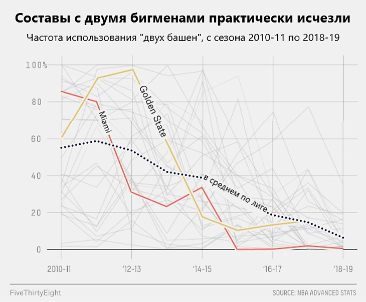 Пик использования «двух башен» (58,8%) пришелся на сезон 2011-12, но за последующие 4 сезона смолл-болльная тенденция срезала этот показатель ровно наполовину. В прошлом сезоне фронткорт из двух бигменов провел на паркете всего 6,4% от общего игрового времени. А во время второго сезона существования «Биг Трио» данный показатель был равен не менее 50%. В прошлом сезоне ни одна команда не пересекла отметку в 40% времени с двумя большими на паркете.