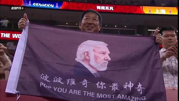 Главного тренера Сан Антонио Сперс и сборной США по баскетболу Грегга Поповича любят и уважают во всем мире. На фото один из болельщиков на Чемпионате мира в Китае с баннером, который гласит: "Поп ты самый потрясающий"
